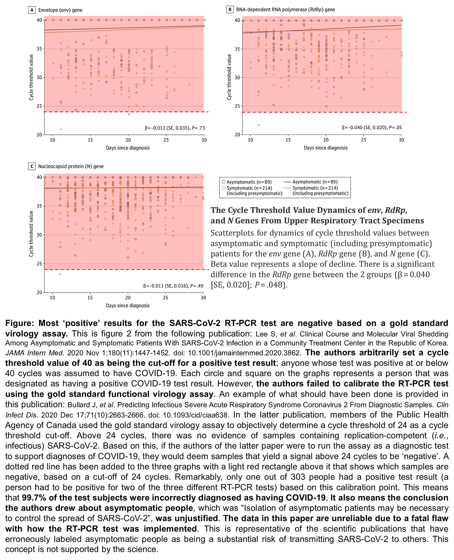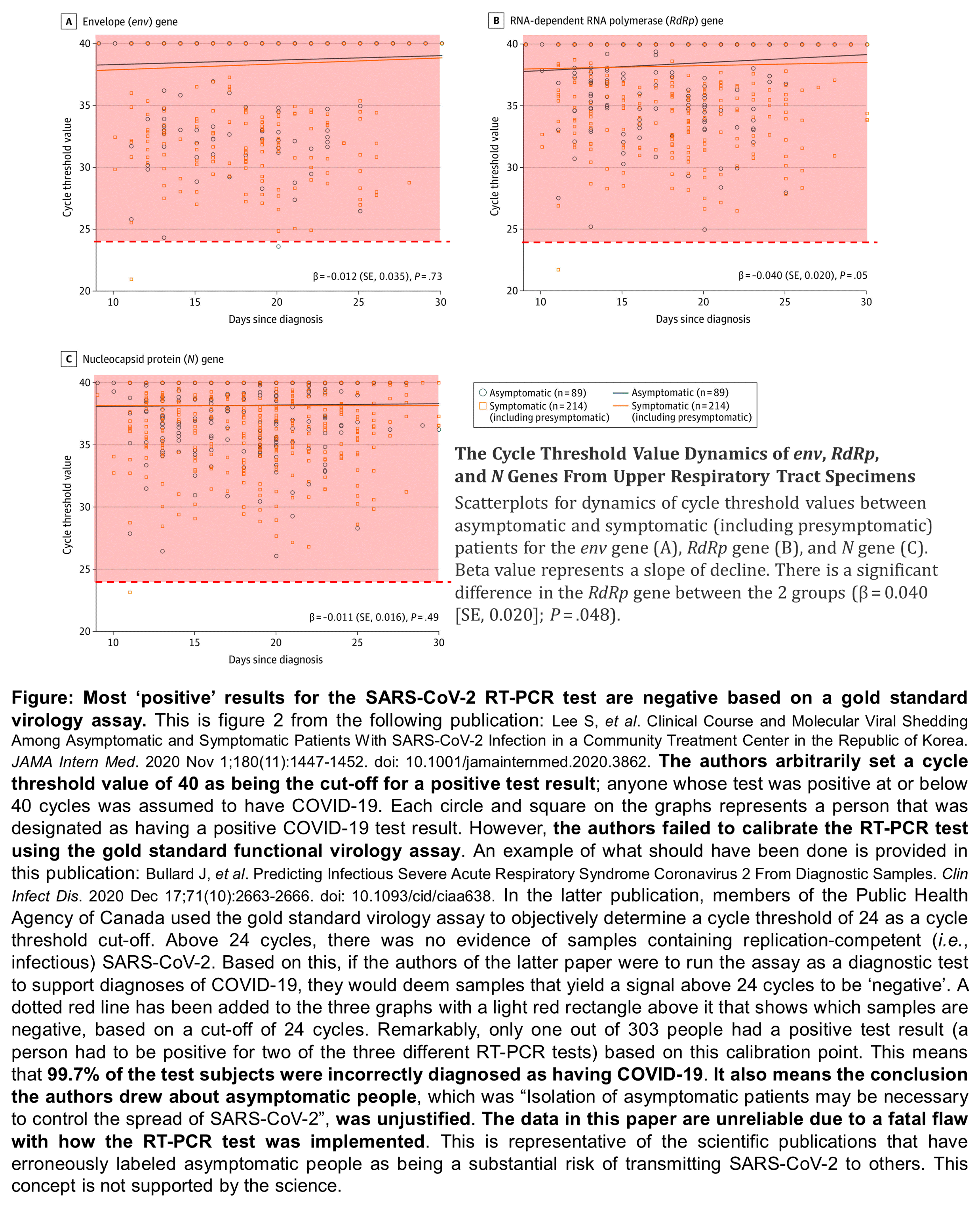 Remarkably, the authors applied an arbitrary cycle threshold of 40 to define a positive test result. Proper calibration of the test was not performed. I applied a new cycle threshold cut-off of 24, based on the published results of the Canadian study for calibrating a RT-PCR test for SARS-CoV-2. This is shown as a red dotted line on the graphs in the figure above. Symbols appearing in the light red rectangle above this line would be considered negative, in contrast to the positive designation that the authors had assigned. Remarkably, 99.7% of the people the authors declared to be harbouring infectious SARS-CoV-2 likely had no evidence of potentially infectious SARS-CoV-2 virions, had the test been properly calibrated. This represents a fatal flaw in this paper; one that negates its conclusion that “Isolation of asymptomatic patients may be necessary to control the spread of SARS-CoV-2”. It should also precipitate its retraction. Such a paper should never have been allowed to be published in the first place.