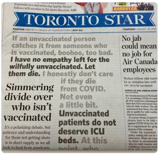 We were told that everyone had to do their part to prevent hospitals from being overwhelmed. Those who felt healthy could not be trusted. Unbeknown to them they might have a wicked pathogen oozing out of their body. Healthy children who were at a statistical risk equivalent to zero of dying from COVID-19 would almost certainly kill their grandparents if they were not locked down, masked and ‘vaccinated’. Those who resisted lockdowns, masking, and mandating of so-called vaccines that could neither prevent the disease nor transmission of its causative agent have been treated like uncaring villains that are deserving of segregation. Remember this front page of one of Canada’s best-known newspapers that was published on August 26, 2021?…