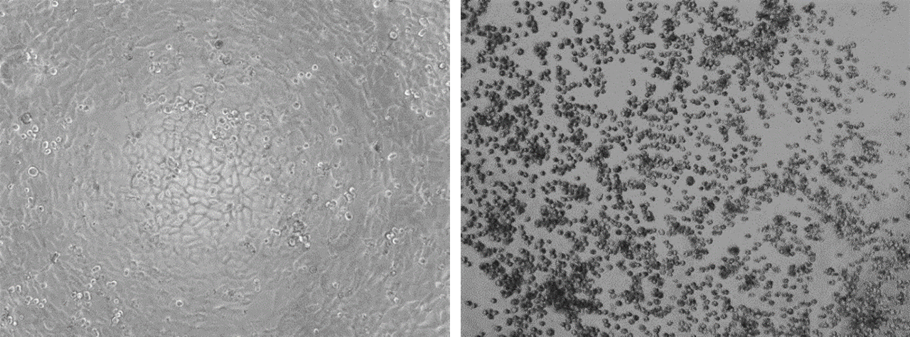 …the cells on the left were not exposed to a replication-competent (infectious) virus. They remain happily adhered to the bottom of the dish. There was no cytopathic effect. The cells on the right were exposed to a replication-competent virus that infected and killed them. As the cells died, they rounded up and lost their ability to remain stuck to the bottom of the plate. This is a classic example of cytopathic effect. You can see how easy it is to use this test to determine whether a sample contains any infectious virions.