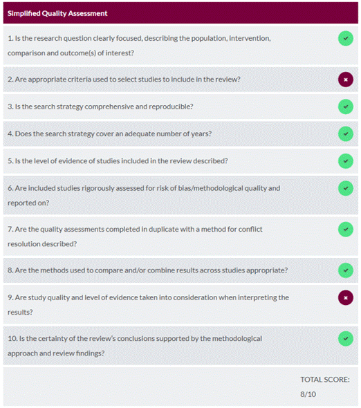 …it gets highly rated; an 8 out of 10 to be exact. Note that it gets a checkmark for “the certainty of the review’s conclusions”. After all, a physician would want to be certain that the evidence they are using to inform their clinical practice is solid.