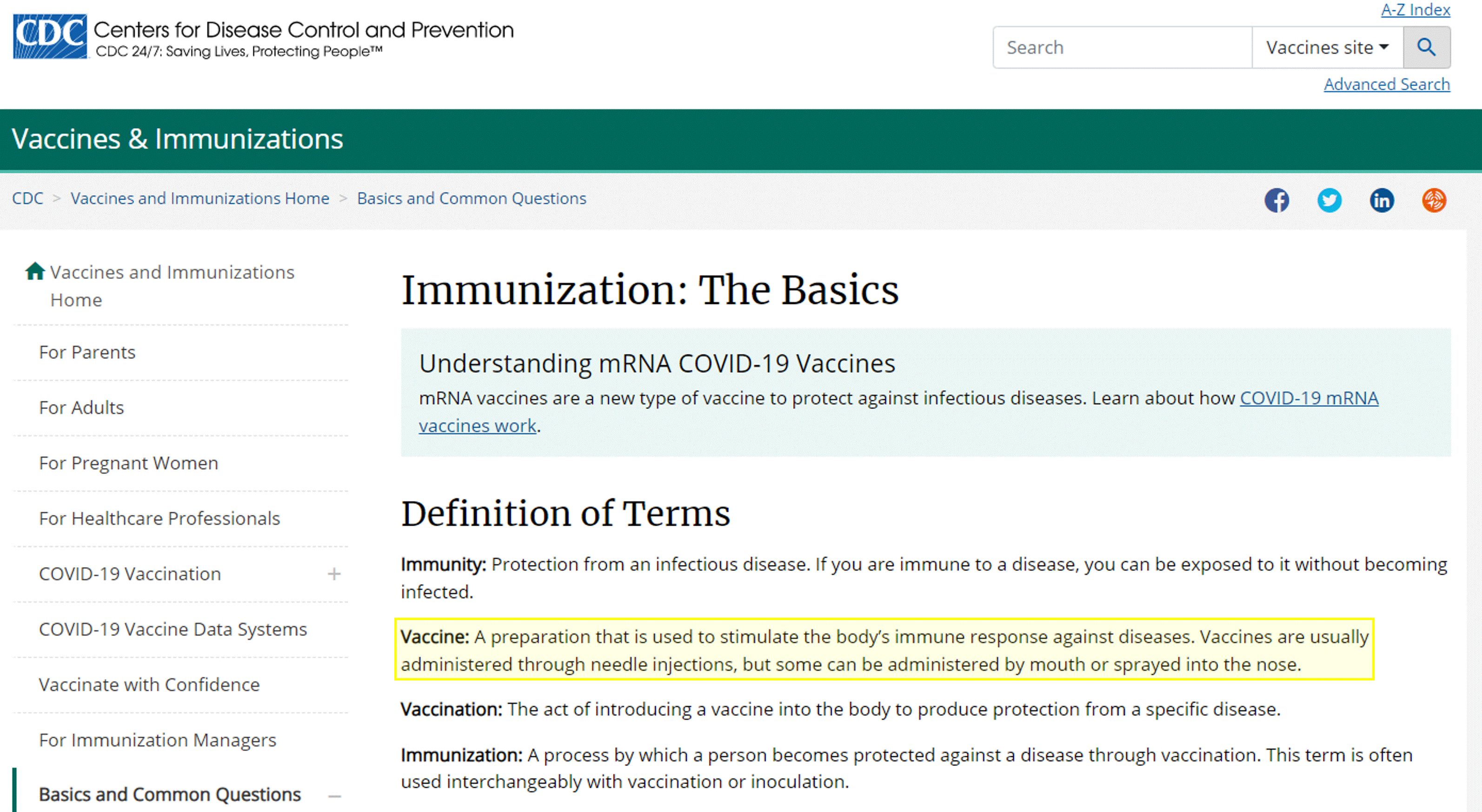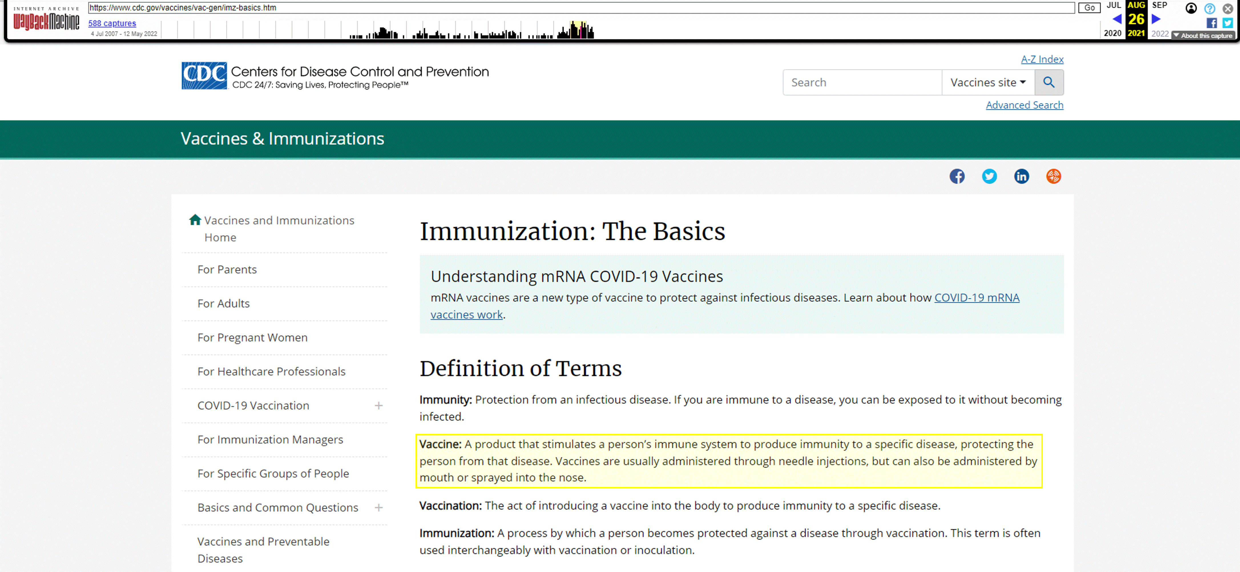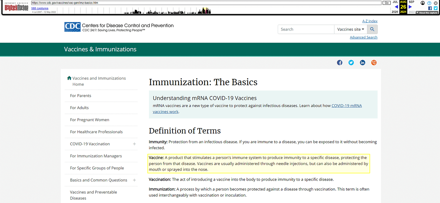 Using the WayBack Machine, one can see on August 26, 2021, what the United States Centers for Disease Control and Prevention (CDC) accepted as the definition of a vaccine (highlighted in yellow)…