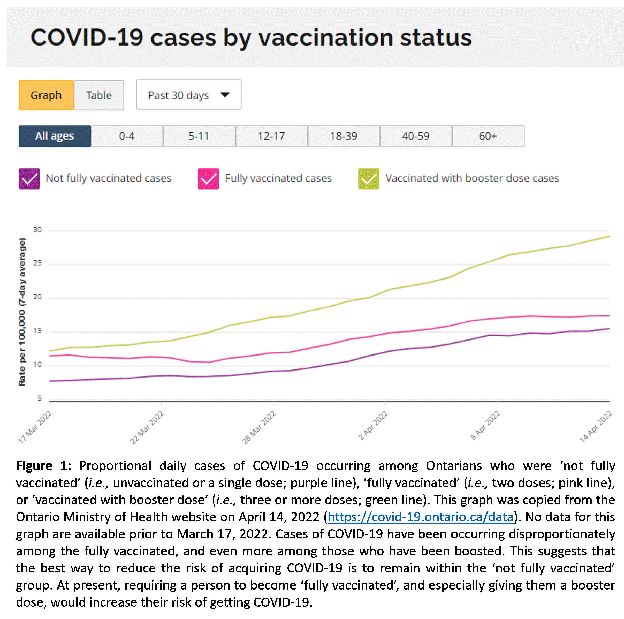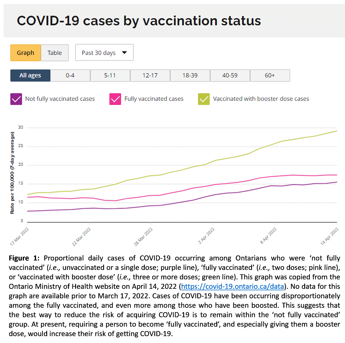 As demonstrated in this paper, people whose immune response was induced by Pfizer’s mRNA product were at 13-times greater risk of being infected with SARS-CoV-2 as compared to people with naturally acquired immunity! For those who had received Pfizer’s mRNA product, this increase in risk of infection also translated into a greater risk of the infection progressing to the disease that we call COVID-19. This news will be shocking for many. However, for many of us who have actually been following the science, this is not at all surprising. We have seen this unfolding for quite some time in public health data around the world. For example, see figure 1 below, which showed the trend in cases of COVID-19 by vaccination status in Ontario, Canada (where I live).