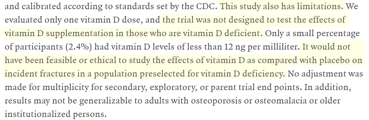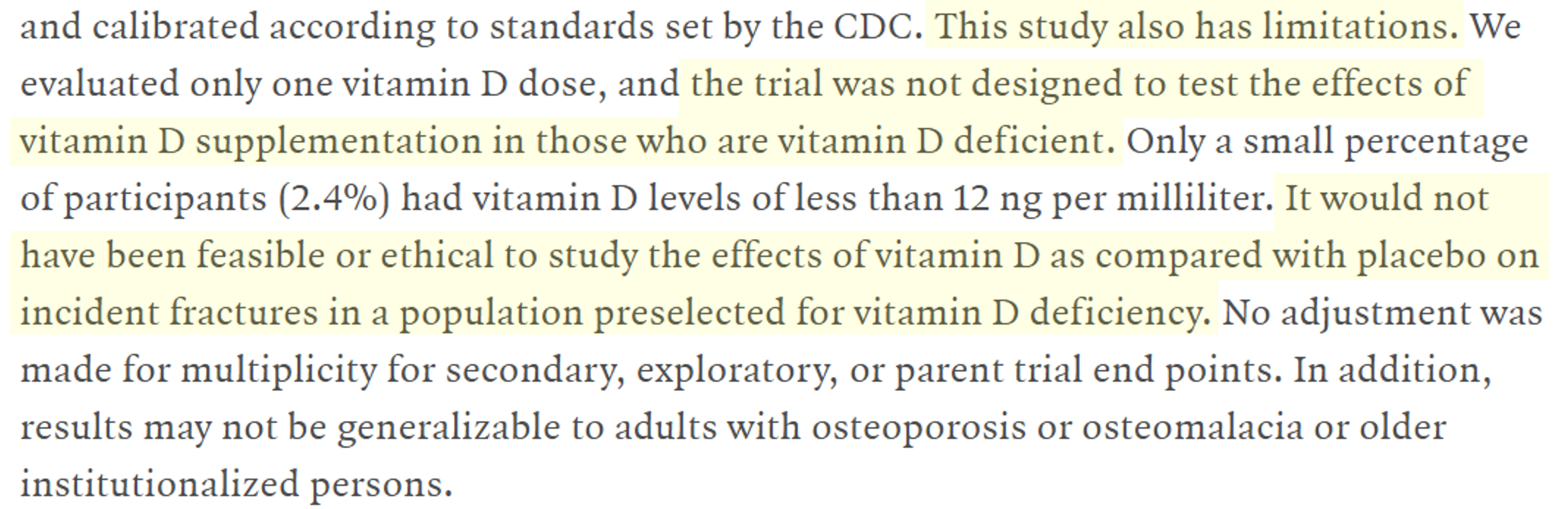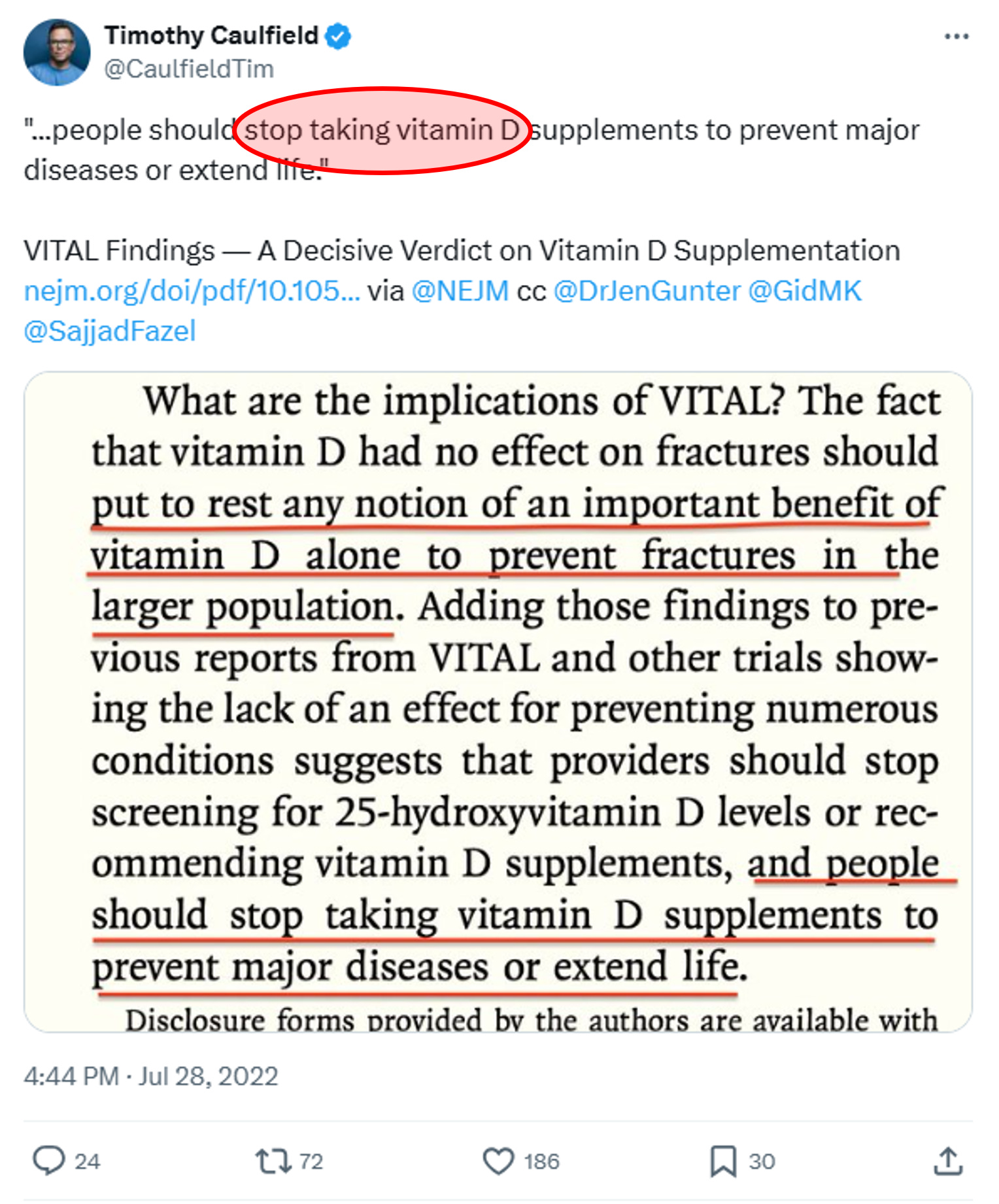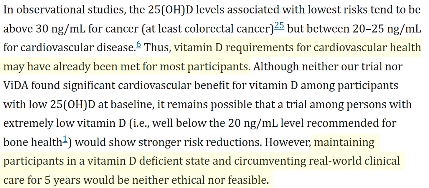 As quoted in Caulfield’s X-post, these two authors of the commentary concluded there was no apparent benefit of vitamin D in the context of bone or heart health. However, the commentary failed to acknowledge exceptionally important messaging from the authors of the two studies that were being commenting on.