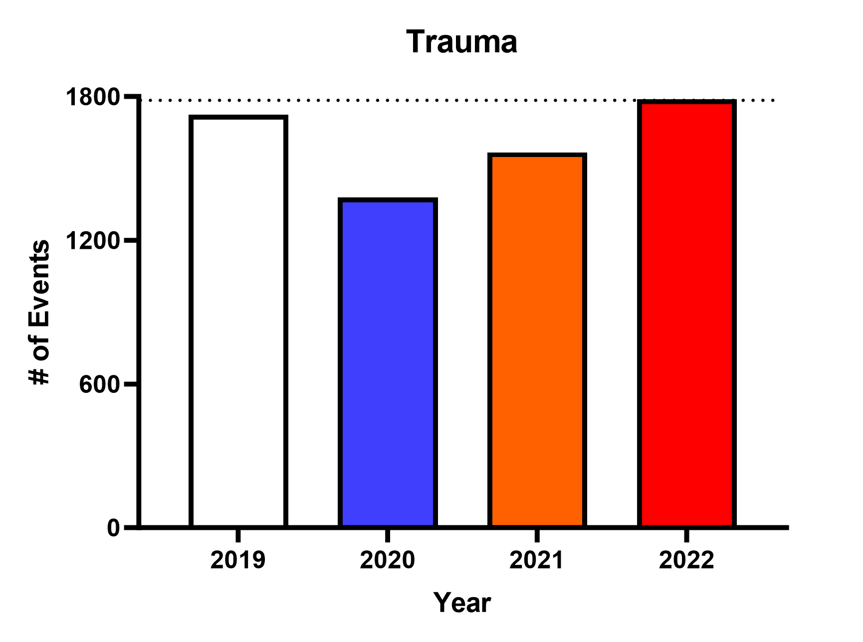 The city publishes a data set about “specialized patient transports by paramedics”. These are important data because they document call volumes for three categories of medical problems that were confirmed by paramedics. Many data sets will document the reason for a call based on what was initially reported by whomever made the initial contact with an emergency centre. These reasons are often corrected once paramedics can accurately assess the situation. In other words, the underlying causes of calls in this data set from Toronto are considered to be accurate. Of concern, they tell the same story that I have been observing repeatedly.