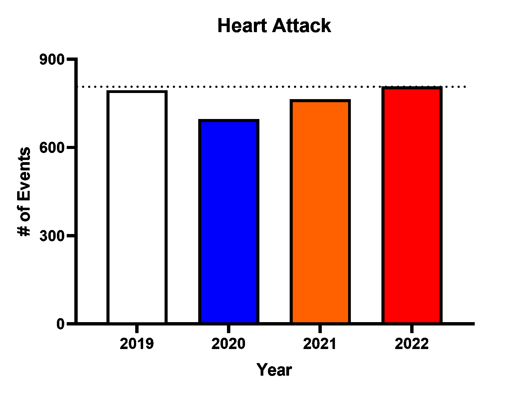 Here are the call volumes for “confirmed ST-Elevated Myocardial Infarction”, also listed as heart attacks. As per an email communication from a Commander in Toronto’s paramedic service, this particular data set “will better reflect the trend in pre-hospital cardiac conditions.”…