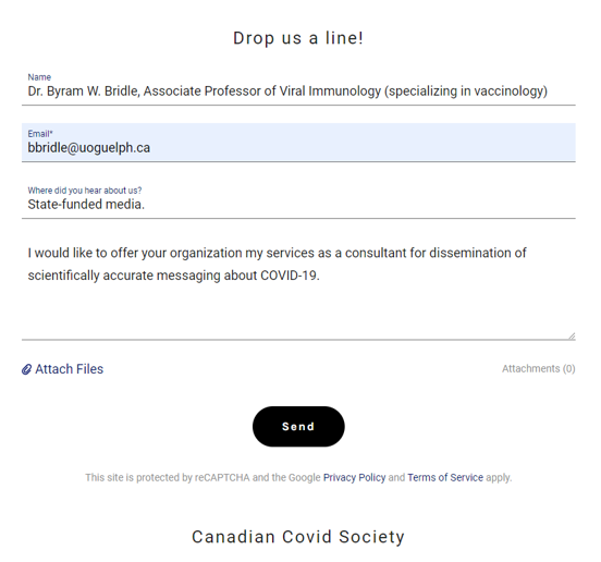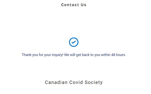 I just did a search of my email inbox for “Canadian Covid Society”. I could not find a response to my offer to assist them with ensuring the accuracy of the information they disseminate. It appears like their invitation to engage in communication might be based in segregation. Also, their promise to respond within 48 hours seems like misinformation. Be extremely cautious of people who refuse to talk to those who approach them with peer-reviewed science in-hand.
