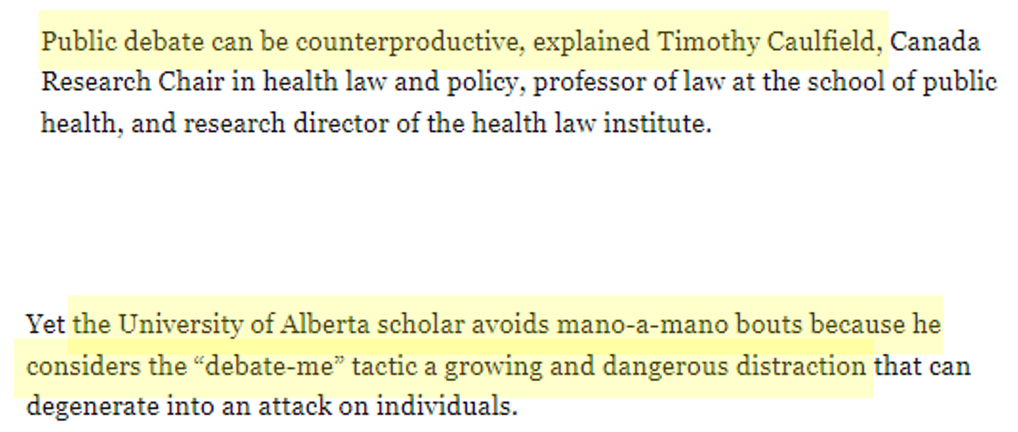 A great example of Prof. Mr. Timothy Caulfield failing to engage in public discussions with those against whom he has made public accusations can be found in this article. Here are a couple of quotes from Prof. Mr. Caulfield taken from this story…
