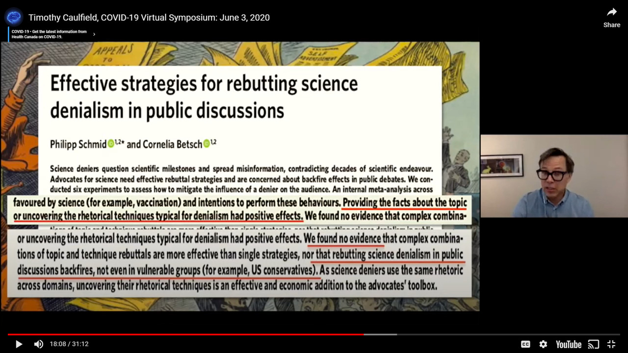 Most importantly, Prof. Mr. Caulfield indirectly led me to a peer-reviewed paper published in a prestigious journal that covers the topic of ‘misinformation’. He has openly declared his love of this paper when teaching the masses about ideal, science-backed strategies to debunk scientific myths. He presented this in a talk given remotely to attendees at Columbia University in the USA early in the declared COVID-19 pandemic. You really should watch the entire video. Among what I am going to share with you here, it shows how Prof. Mr. Caulfield loves to defame entire groups of people and pull up pictures of people and literally label them and accuse them in the absence of any original data to back it up. Interestingly, if you watch the Q&A period at the end, you will see how much Prof. Mr. Caulfield offended some members of the audience through his love of labeling people with derogatory terms. He thought it was really funny and entertaining to repeatedly label people as ‘conspiracy theorists’. He seemed to be clueless to the fact that this term has substantial negative connotations among the black community in the USA (and likely many other places). He got his wrist slapped publicly and emphatically by two attendees. As per his Twitter feed, he has failed to be more sensitive as he suggested he would be when he was embarrassed after his talk.