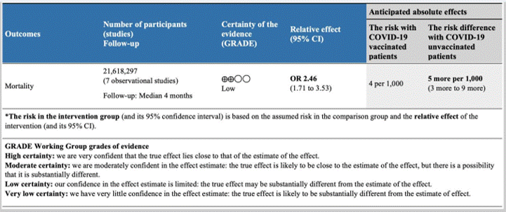 “Evidence for mortality from COVID-19 infection by vaccination status was available from seven observational studies included a total of 21,618,297 patients. After rating down one level for study design, we considered the evidence to be low-quality for an observational study design. These observational studies suggest that COVID-19 vaccination may substantially reduce mortality (OR 2.46, 95% CI 1.71 to 3.53; low-quality evidence). “