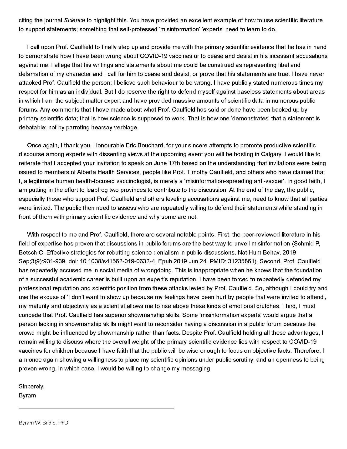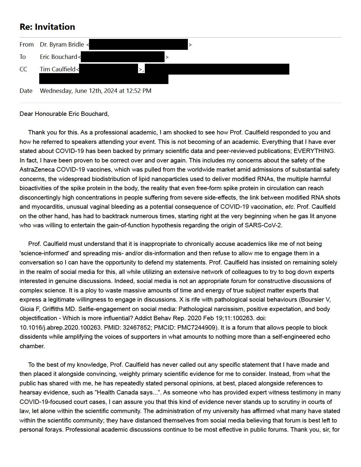 Applaud you for continuing to reach out to Caulfield. Not surprisingly he will continue to reject all requests for speaking at an open public forum. All those who accuse others of disinformation and misinformation are almost always purveyors of lies themselves. Thanks to all the lying about so many issues by academics, billionaires, bureaucrats and politicians many words like Nazi and racist have no discourse meaning anymore.