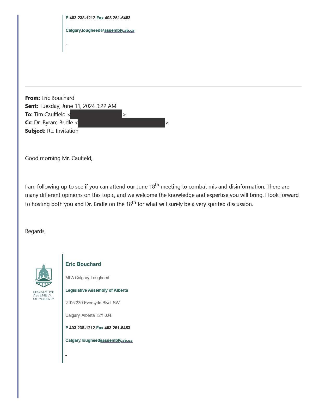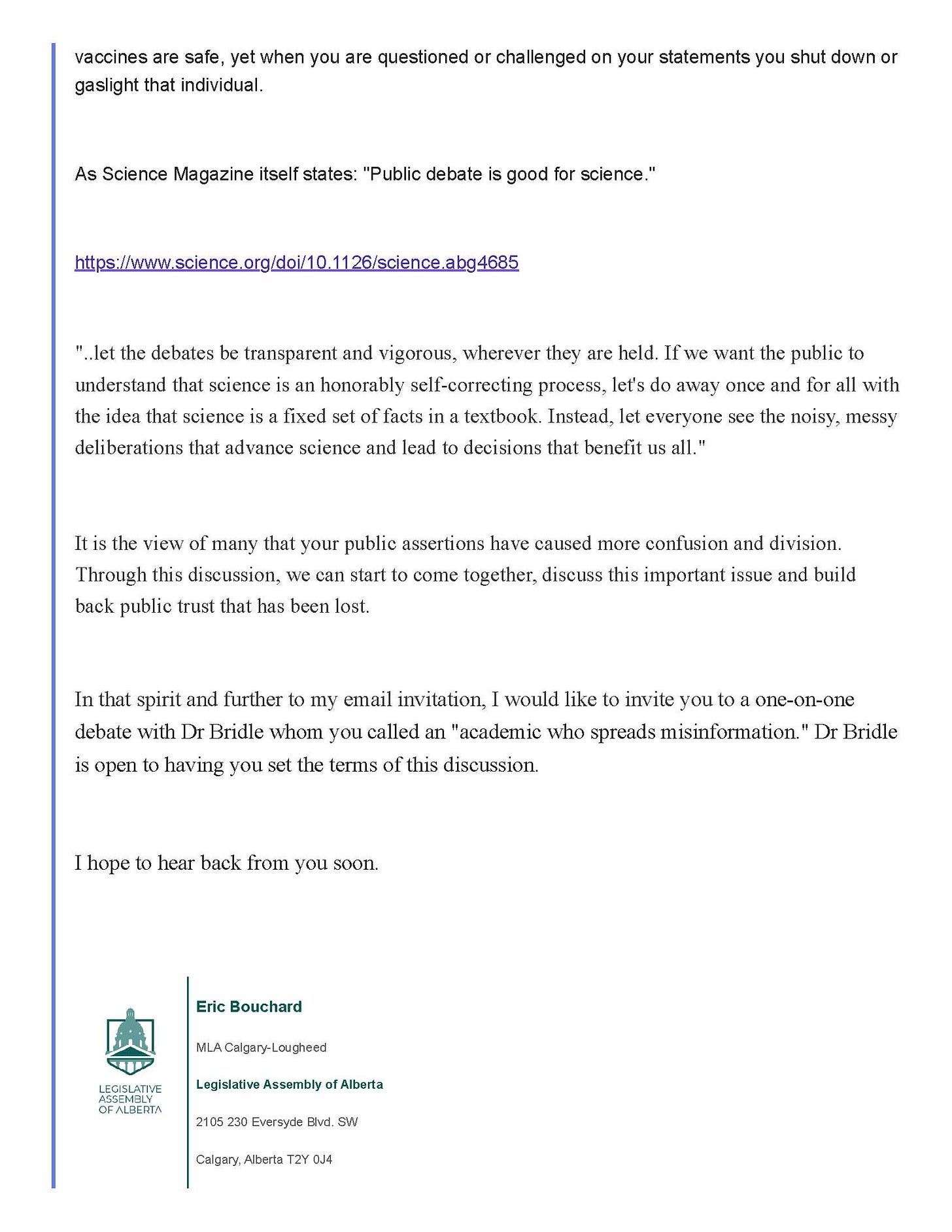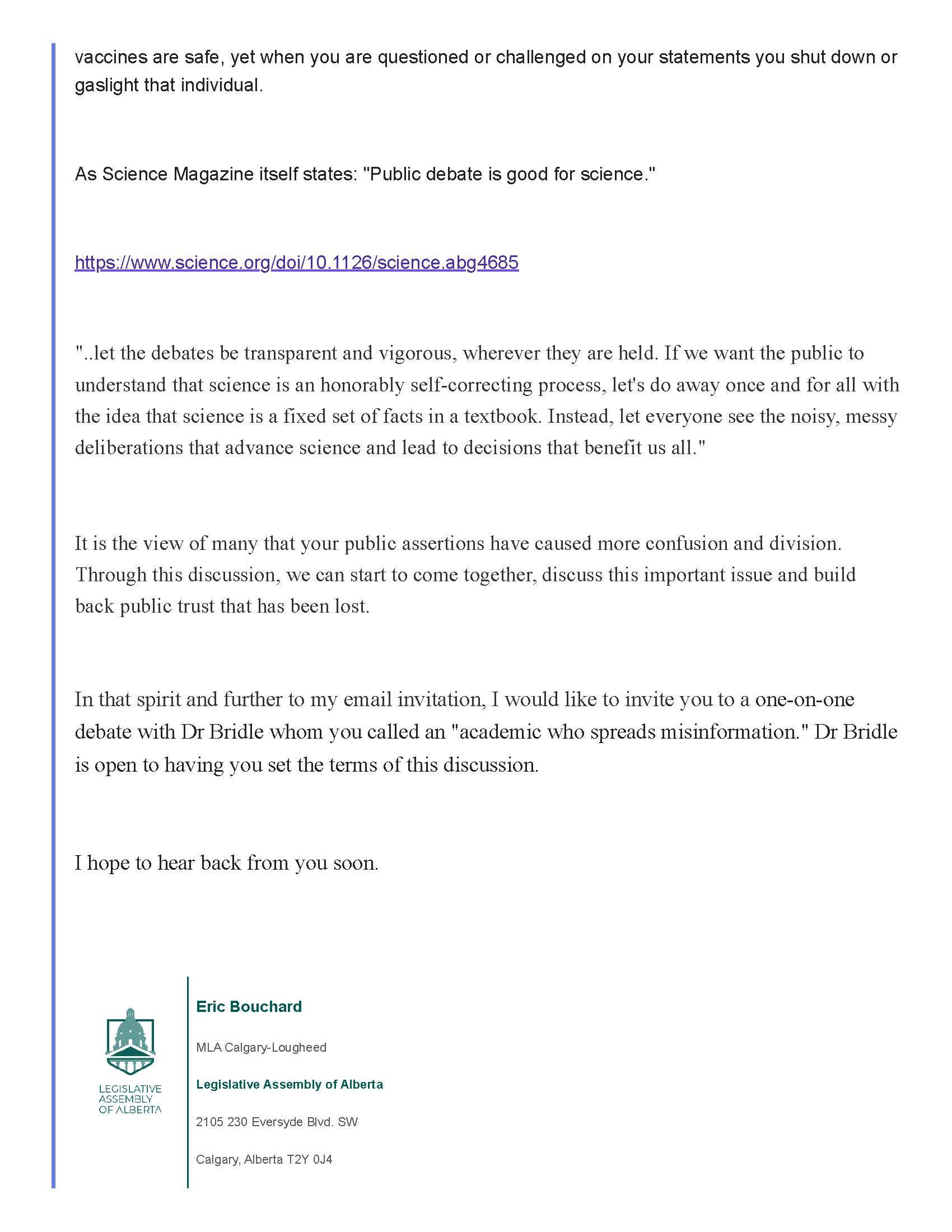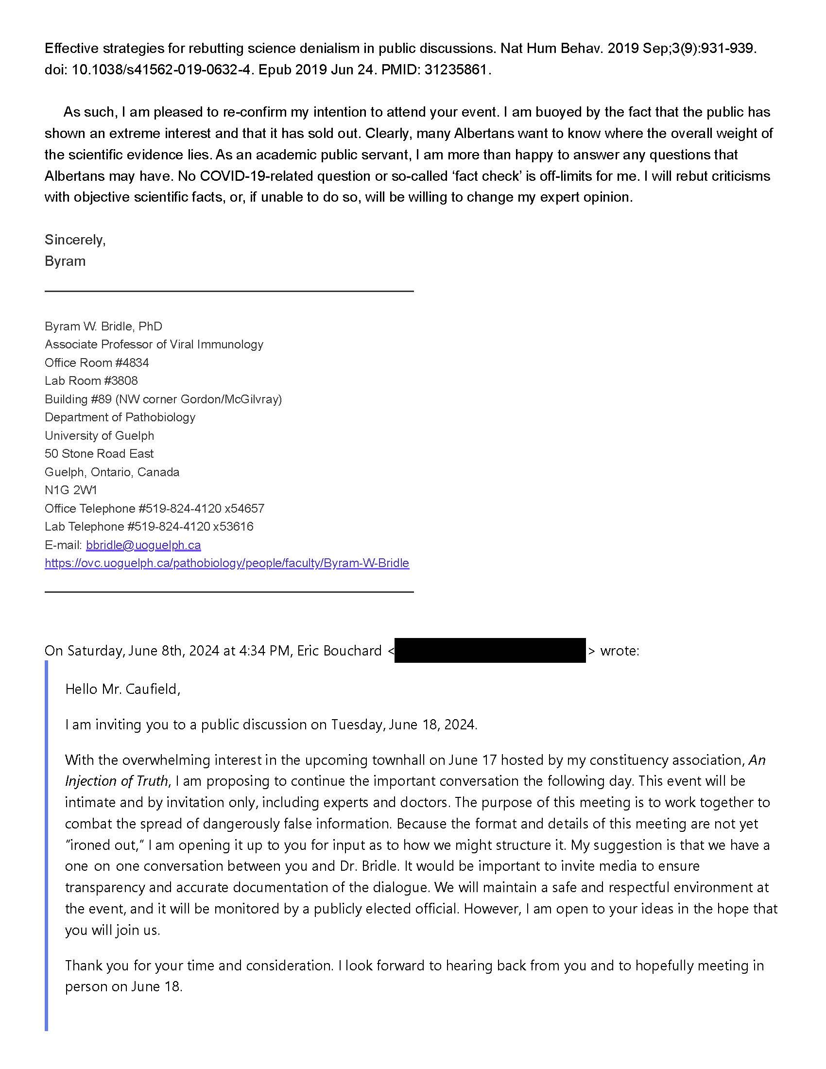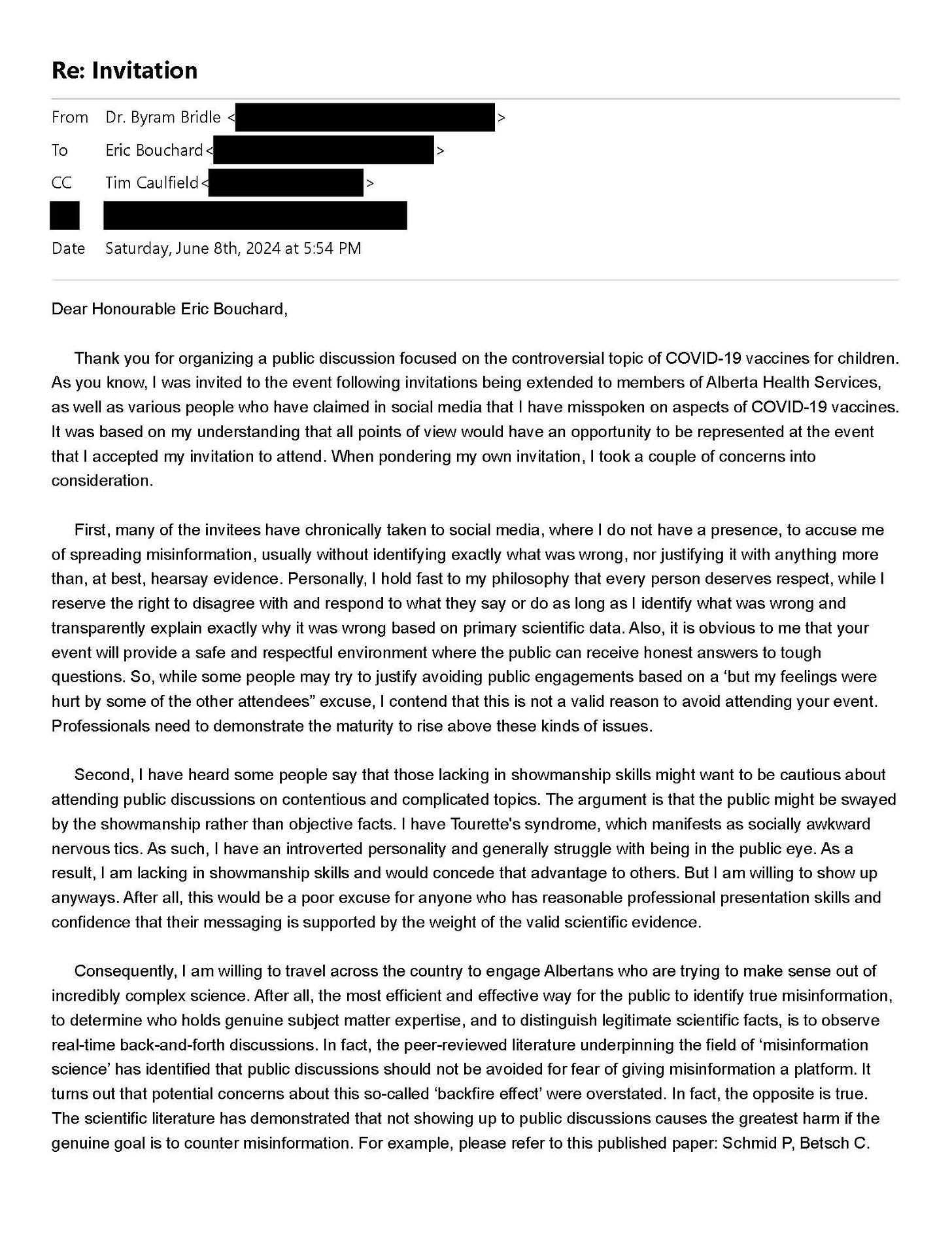 So, with the permission of the member of Alberta’s legislative assembly that is hosting the upcoming public discussion about COVID-19 vaccines for children, I am sharing with you below a series of communications in which both Prof. Caulfield and I were addressed. You can make your own determination about who is willing and able to publicly defend their stance about COVID-19 vaccines and why or why not.